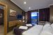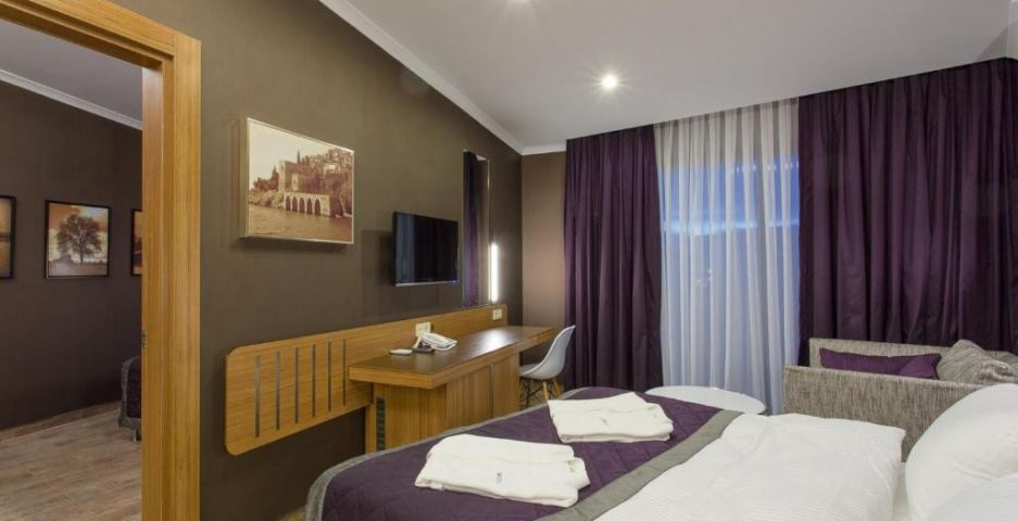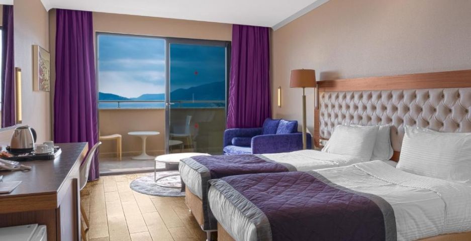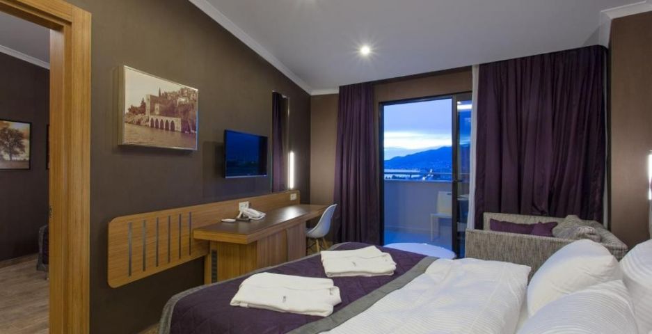 В стаите: Всички стаи са обзаведени в модерен стил. В цялата сграда всички стаи са с пълен или полуъглов изглед към морето и планината; електронна система за заключване на вратите и противопожарна аларма, мини бар, електрическа кана, комплект за чай и кафе, сателитен LCD телевизор, излъчване на музика (чрез телевизионни канали), душ и тоалетна, сешоар, директен телефон, климатик, двойни или френски легла, разтегателен диван за трети човек, сейф, балкон, аксесоари за баня (чехли, комплект за баня и др.), керамични подове, цветно дърво. Почистване на стаите - всеки ден, смяна на спално бельо хавлиени кърпи – 3 пъти седмично.