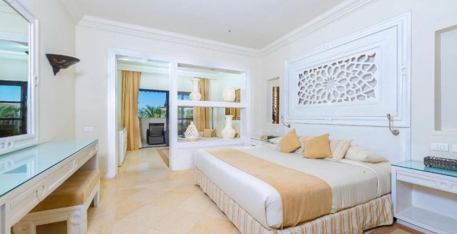 Junior Suite - Голяма спалня king size и зона за отдих. Други удобства: балкон с изглед към градината, басейна или морето, баня с вана и душ, климатик, сешоар, сейф, телефон, телевизор с плосък екран, сет за приготвяне на кафе и чай, минибар